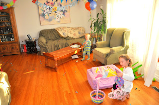 Easter morning checking out what the Easter bunny brought. Muffin was here too but she came down in her birthday suit so I made her go back upstairs and get dressed so I could take pictures of the mornings events.